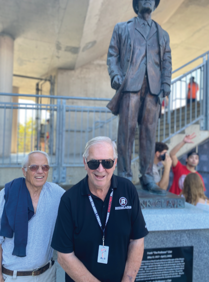 Former Rough Riders John Kruspe and Bob McKeown visit the Frank Clair Statue during the annual Panda game.